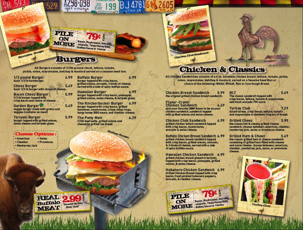 1/3 lb. ground chuck topped with crisp bacon, choice of cheese, lettuce, tomato, pickle, onion, mayo, ketchup and mustard on a sesame seed bun.